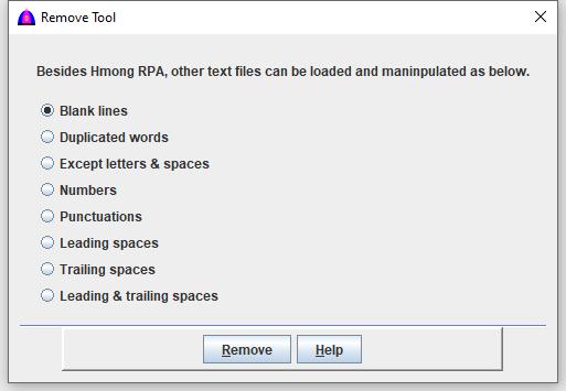 | Duplicated records | Remove duplicated records separated by linefeed, then all records are sorted in ascending order. In a document, there are many lines, and some lines may have one word, two and many words. By using this procedure, it will remove all duplicates for one word, two and many words line by line. Example: Instead of finding and removing duplicates from a list with hundred, thousand or million words from a list manually, use this feature to remove them. |